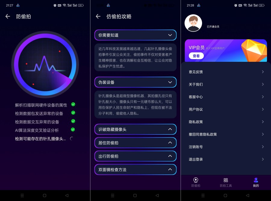中的隐藏摄像头,保护个人隐私安全。该应用利用手