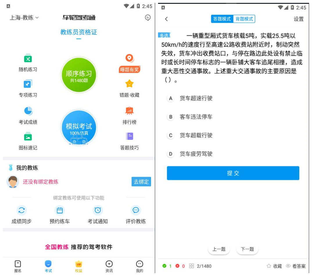 车轮驾考通,学车特轻松!(原名 车轮考驾照)驾校、教练、学员,老司机都极力推荐下载使用的高人气互联网综合驾照考试学车APP! 整合小车、摩托车、客车、货车等完整学车流程,驾校教练帮您划重难点,科目一到科目四全真题库整理解析!直连数据源,实时更新,全真模拟题库为您学车保驾护航! 1、全新题库:恪守2021年新版全国机动车考试大纲,涵盖完整的小车、货车、客车、摩托车题库以及各地方题库、资格证题库,每周更新,每题都有官方解释和答题技巧; 2、多样练题:智能答题,大数据打造你的题库集;专项突破,考点归类针对性练题;精简600+题,3小时快速过理论! 3、理论保过:独家理论保过服务,用车轮驾考通学习理论,考试不过赔100元! 4、教学视频:科目二/科目三教练实拍专业讲解视频,全程剖析考试项目。帮你培养车感,熟悉档位、离合、后视镜,一看即懂,一点即通过; 5、考场视频:科目三真实考场路线视频,教练视频讲解每个点位和考试注意事项。帮你提前熟悉考场环境,缓解紧张,提高考试通过率; 6、灯光/语音模拟:各考场官方灯光数据,真实还原科目三灯光考试场景,在家就能练,稳稳的幸福; 7、考友圈:全国学员和教练的交流圈,有50万教练在线解答学车问题,一起晒攻略、晒驾照、考前许愿、互帮互助,和妹子汉子共同领“证”。 【提示】:全国理论考试中,科目一考试共100题,答对90题或更多 视为通过。科目四考试共50题,答对45题或更多 视为通过。 1、图标速记:分不清图标?5大类,看一遍全知晓! 2、预约考试:清晰指导,自己预约,不错过任何机会! 3、驾考PK赛:邀请好友一起答题,玩着玩着,科一科四就过了。 【提示】:全国理论考试中,科目一考试共100题,答对90题或更多 视为通过。科目四考试共50题,答对45题或更多 视为通过。 感谢耗神的修改和分享,特点如下: 解锁会员特权,会员功能免费使用;软件截图