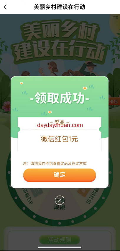 活动路径:登陆农行APP》首页》城市专区(定位佛山) 》 南海优享中心 》 南海一条街 》 美丽乡村建设在行动,支付1.08元即可参与抽奖活动,非必中,亲中1元。 三次参与抽奖机会,所有付费金额都会原路退还。 抽中红包复制连接发送给小号,点击进入领取,推送到服务通知,手动拆红包 活动截至2023年12月31日