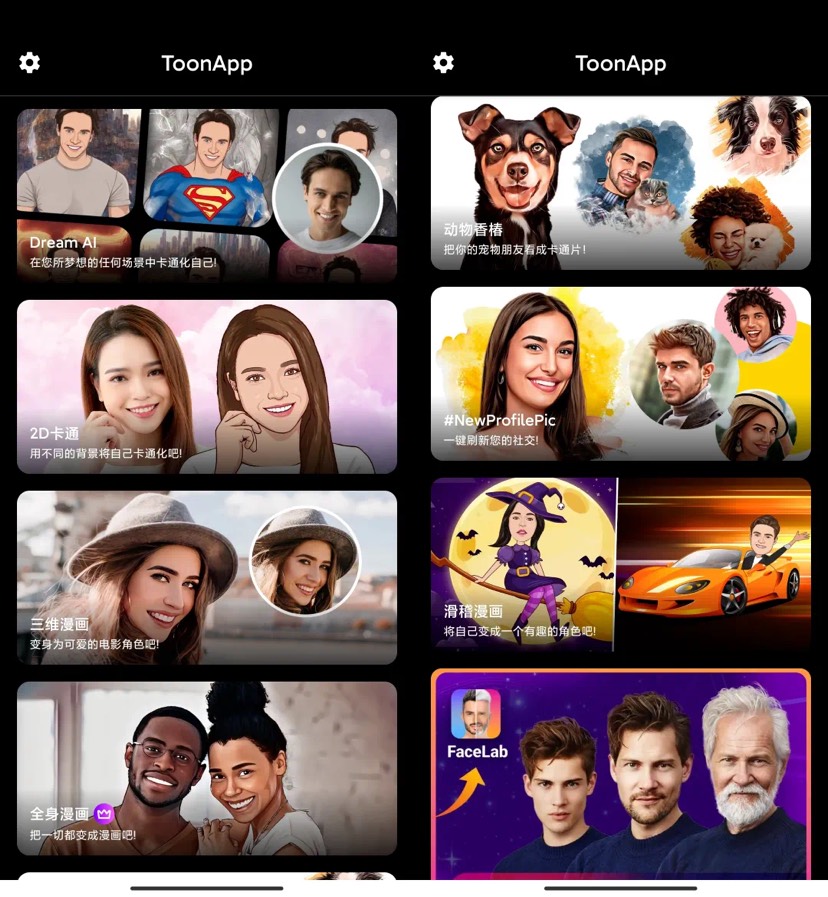 它拥有Dream AI、2D卡通、三维漫画、全身漫画、动物植物、滑稽漫画等效果滤镜供大家任意选择。