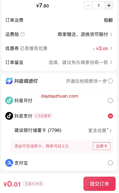 3.抖音扫码打开商品,清风5包抽纸,支付0.01下单 (有些号是2.8,也挺划算自己看着买)