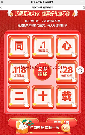 江苏国寿举办的同心二十载喜乐庆佳节话题互动大PK抽红包活动,扫码进入页面,页面下方投票支持即可抽奖一次,有机会中到1元微信红包,自测非必中。