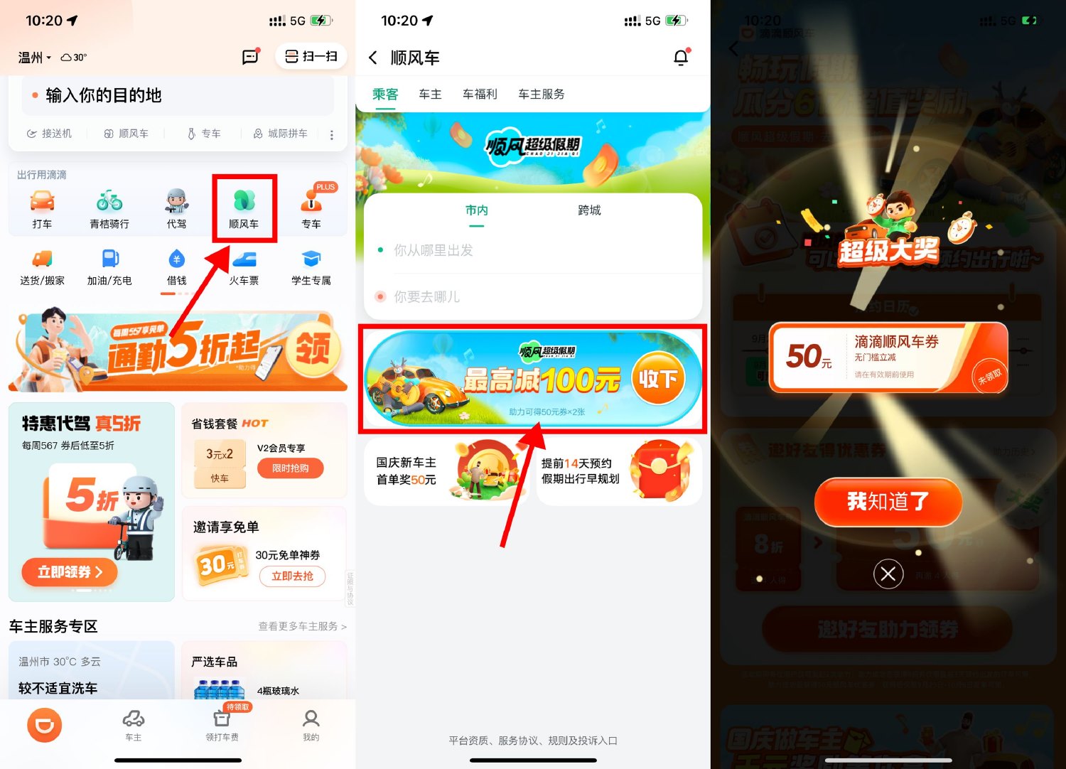 滴滴出行APP或小程序->顺风车->顺风超级假期->邀请8人助力得50元无门槛顺风车券,最多可发起2次助力