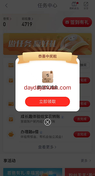 工行开立积存金抽微信立减金的活动还在继续,之前做过的注销后还能继续参与,亲测抽到了5元微信立减金,天天线报网的赚友赶紧上吧。 1、工行APP》任务中心》开通积存交易账户--点击去完成》我的持仓》开立积存金账户,即可抽奖,亲中5元立减金,如果开通过的用户,同样步骤去注销重新开通即可抽奖。