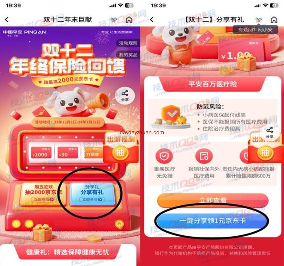平安银行保险双十二免费拿1元京东E卡和1元现金红包