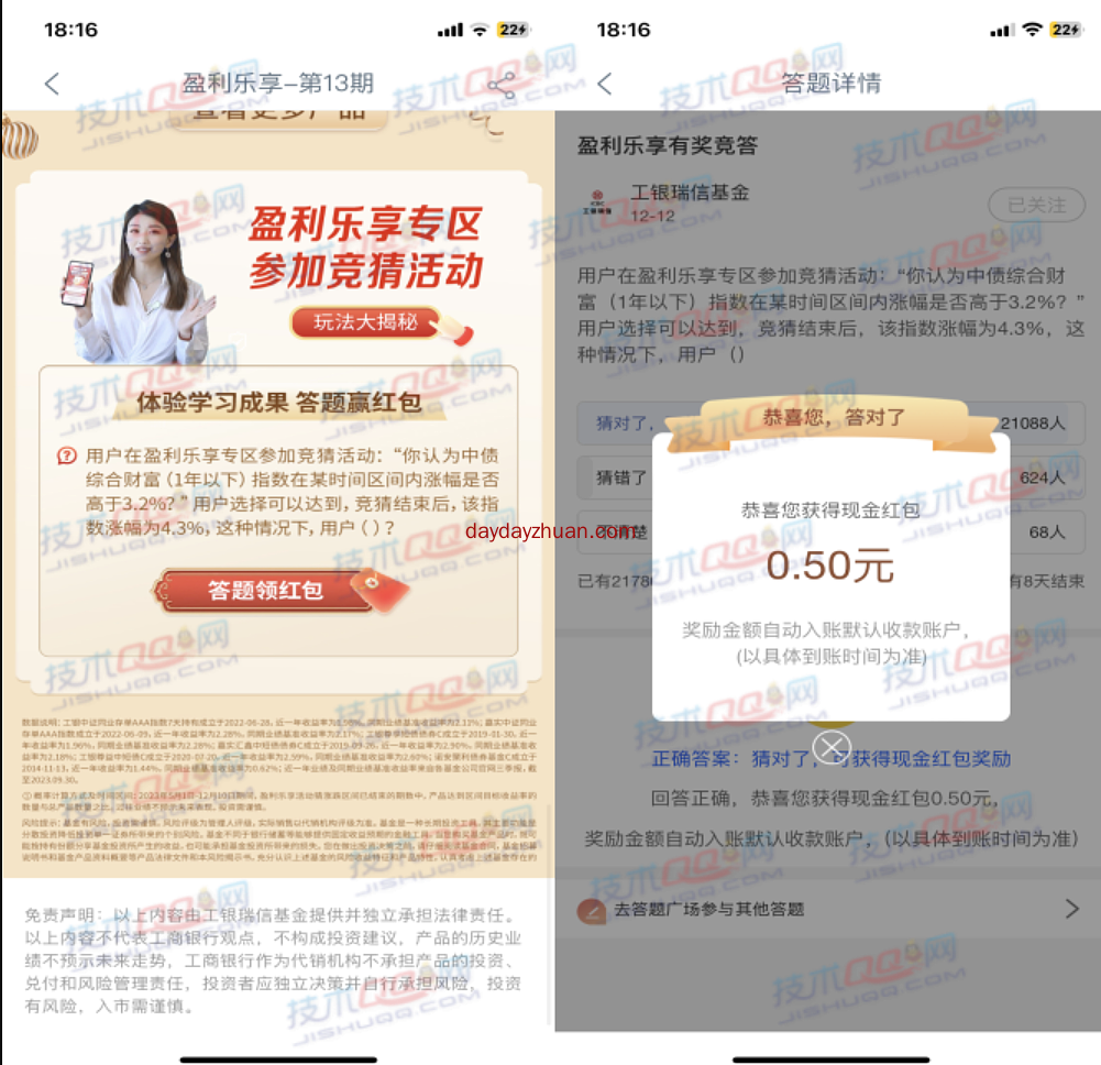 工商银行我的财富我做主有奖活动,参与答题可以领取0.5元红包,红包领取后发放到账户余额,一共限量10万份红包,大家可以撸下