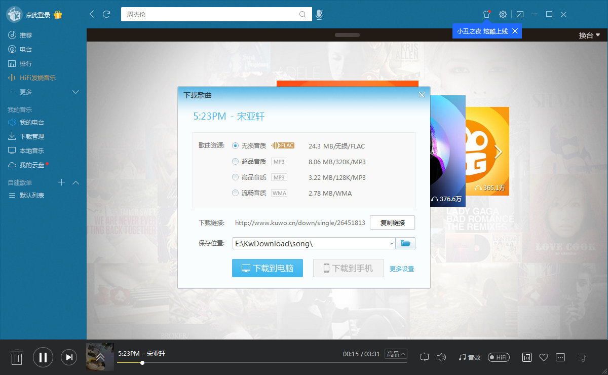 酷我音乐电脑端是一直用的软件,全网会员歌曲/MV 免费下载无需登录歌曲格式包括:无损FLAC/MP3/WMA还可免费下载歌曲MV 1080P蓝光