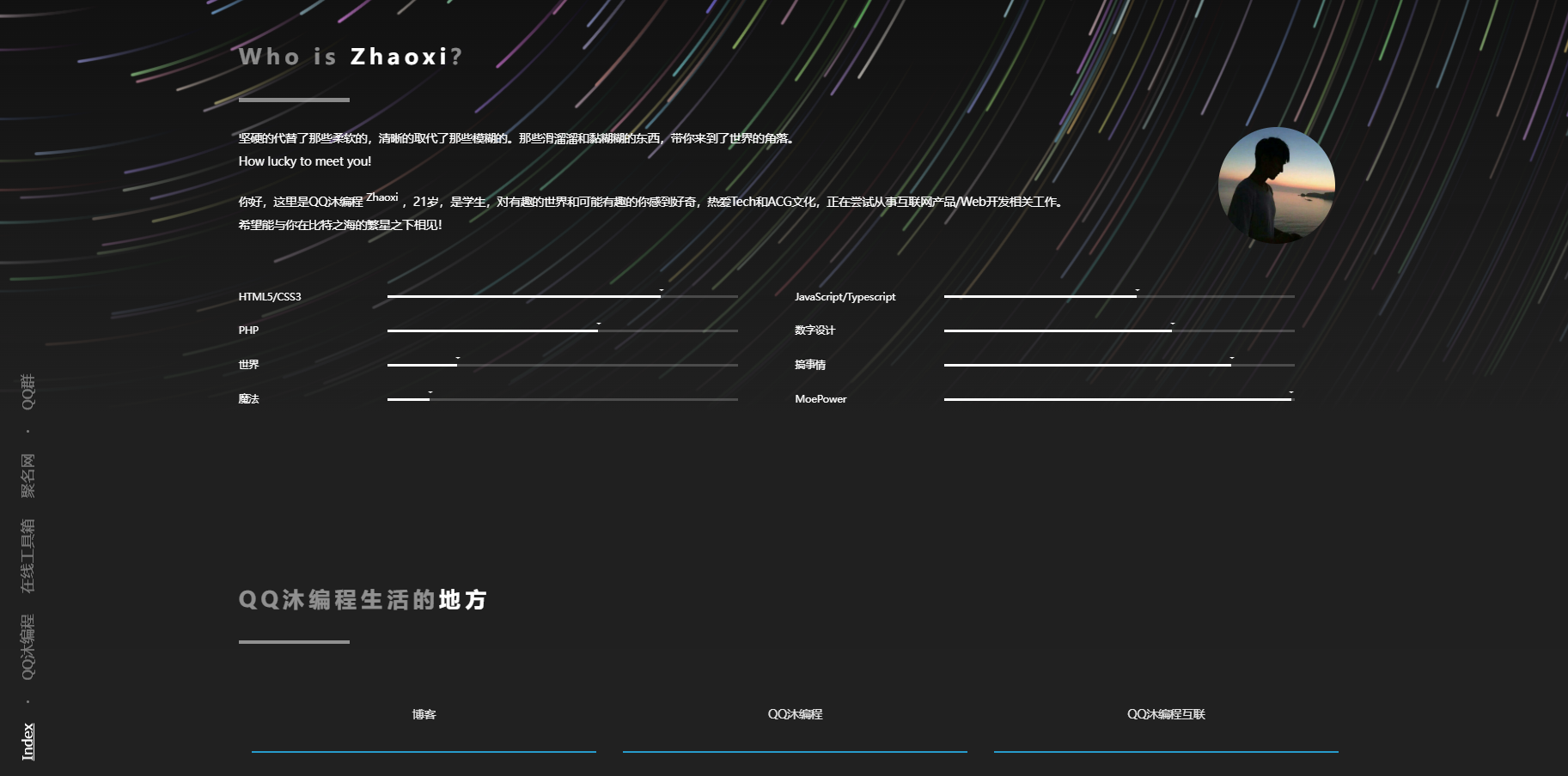 这是一款美观流光作风个人主页HTML源码,觉得挺喜欢的,需求的自行下载! 蓝奏云:https://xiaok.lanzoum.com/iOWGr1ubp2je